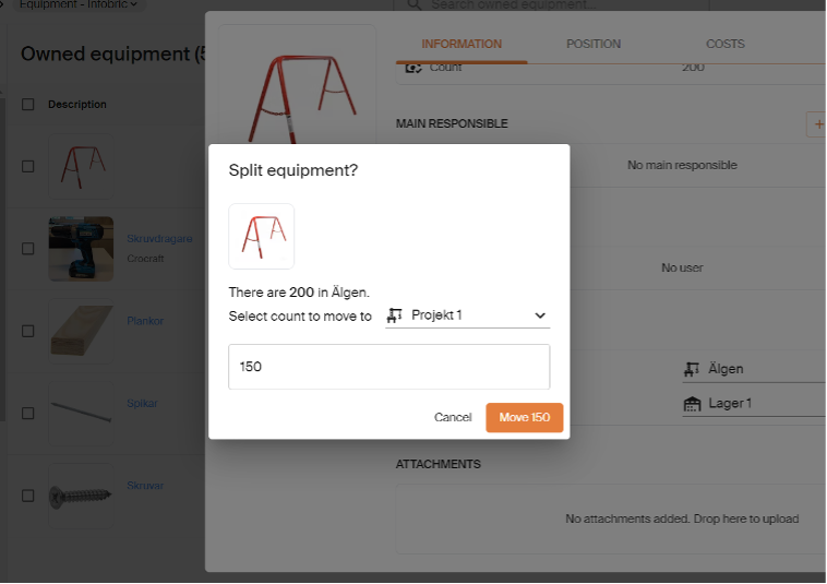 Då kan du klicka på Nuvarande plats och följande ruta kommer att bli synlig (se bild nedan). Välj då antalet gipsbockar som ska flyttas till den nya platsen. Detta kan göras antingen i artikelkortet eller direkt från artikellistan.